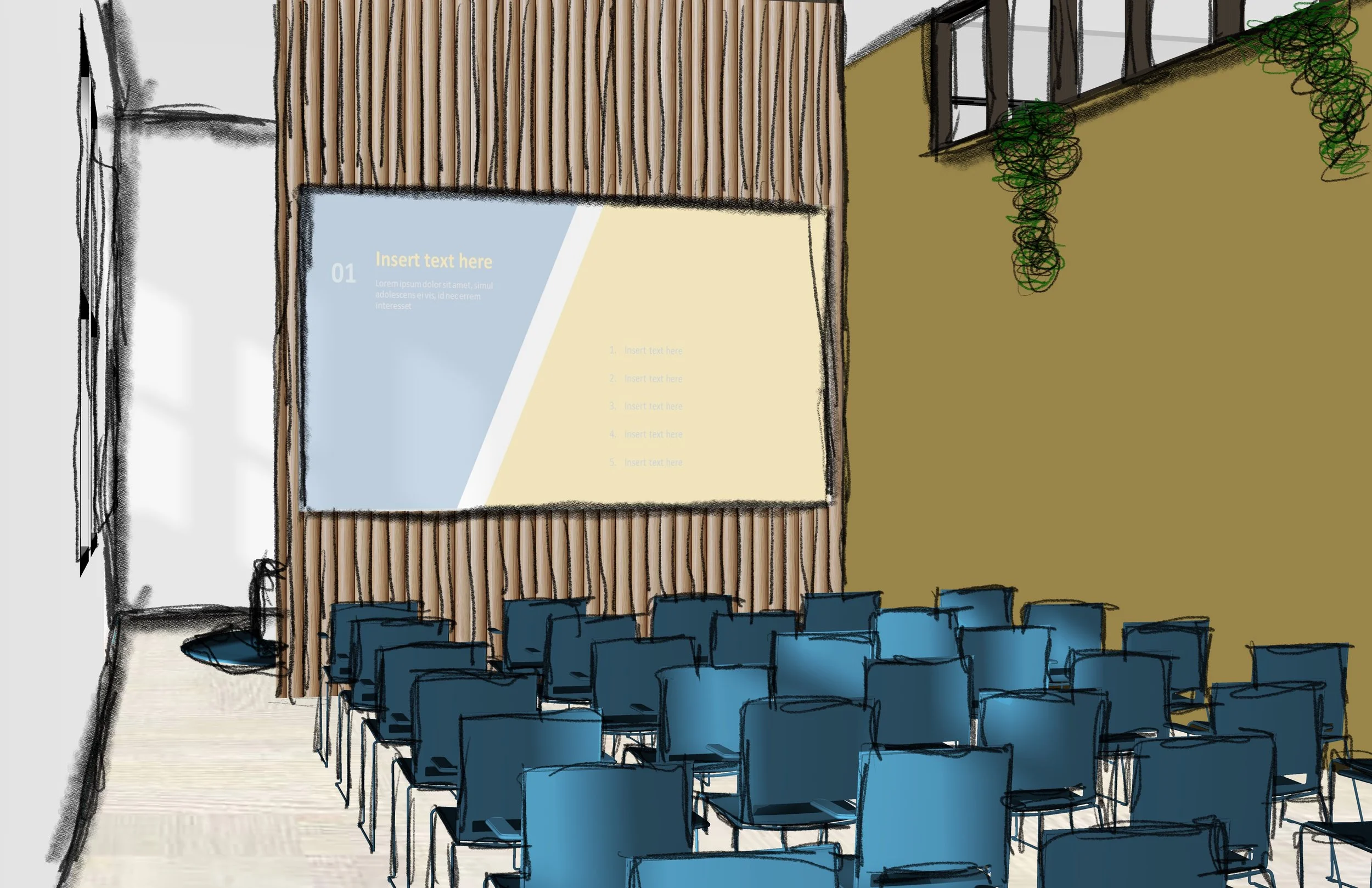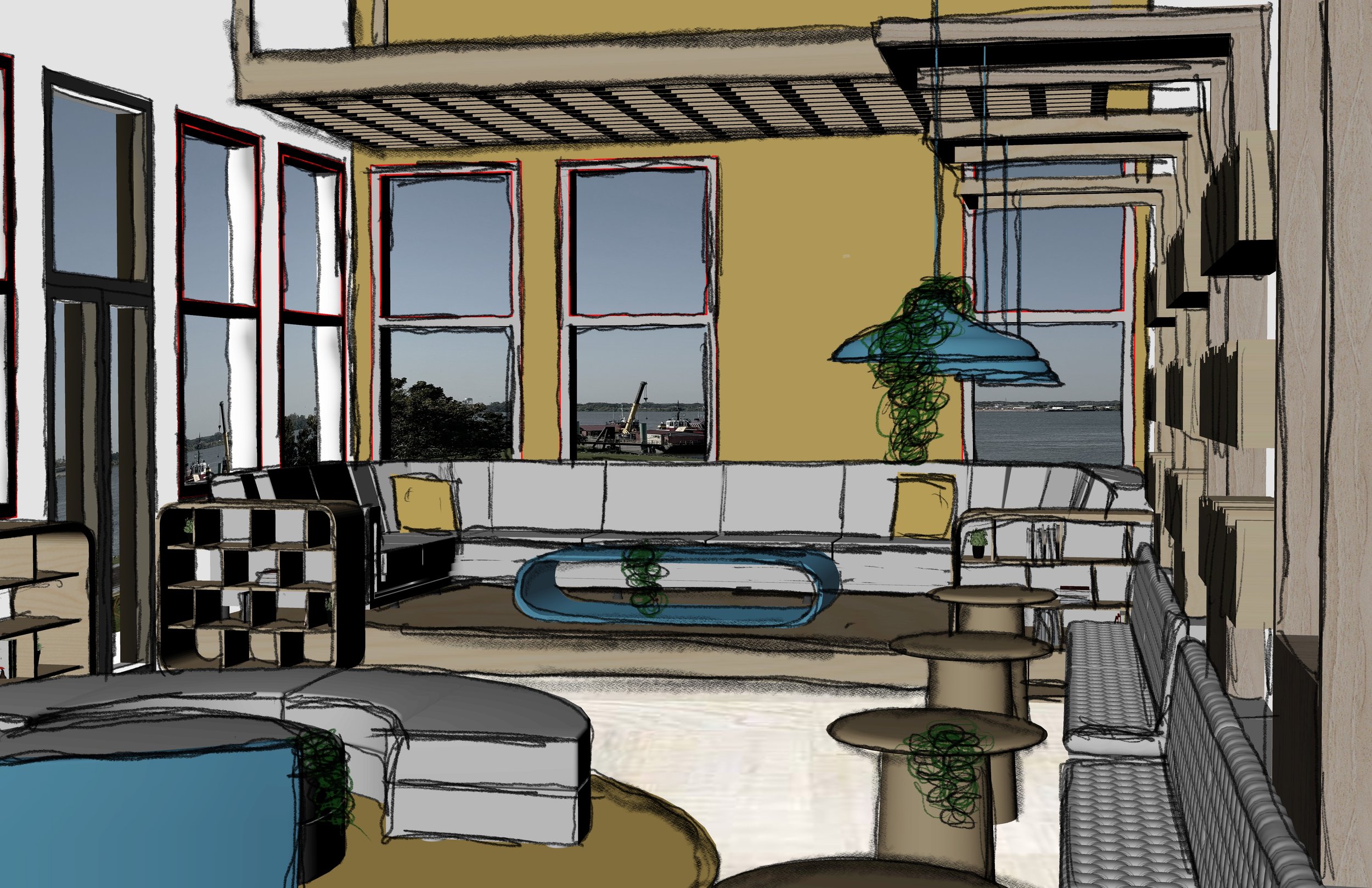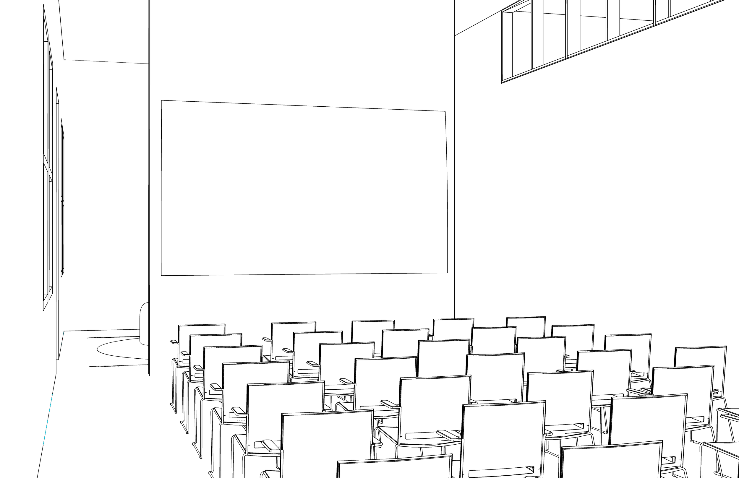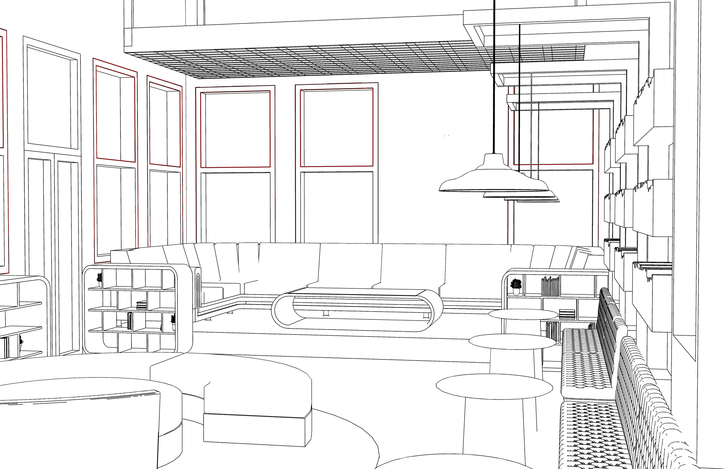 Deliverables included a detailed adjacency diagram, two building sections, a floor plan, material inspiration board, and five rendered perspectives. The full project was developed through a 3D model built in Rhino and SketchUp, with graphic and presentation support from Adobe Illustrator and Photoshop.