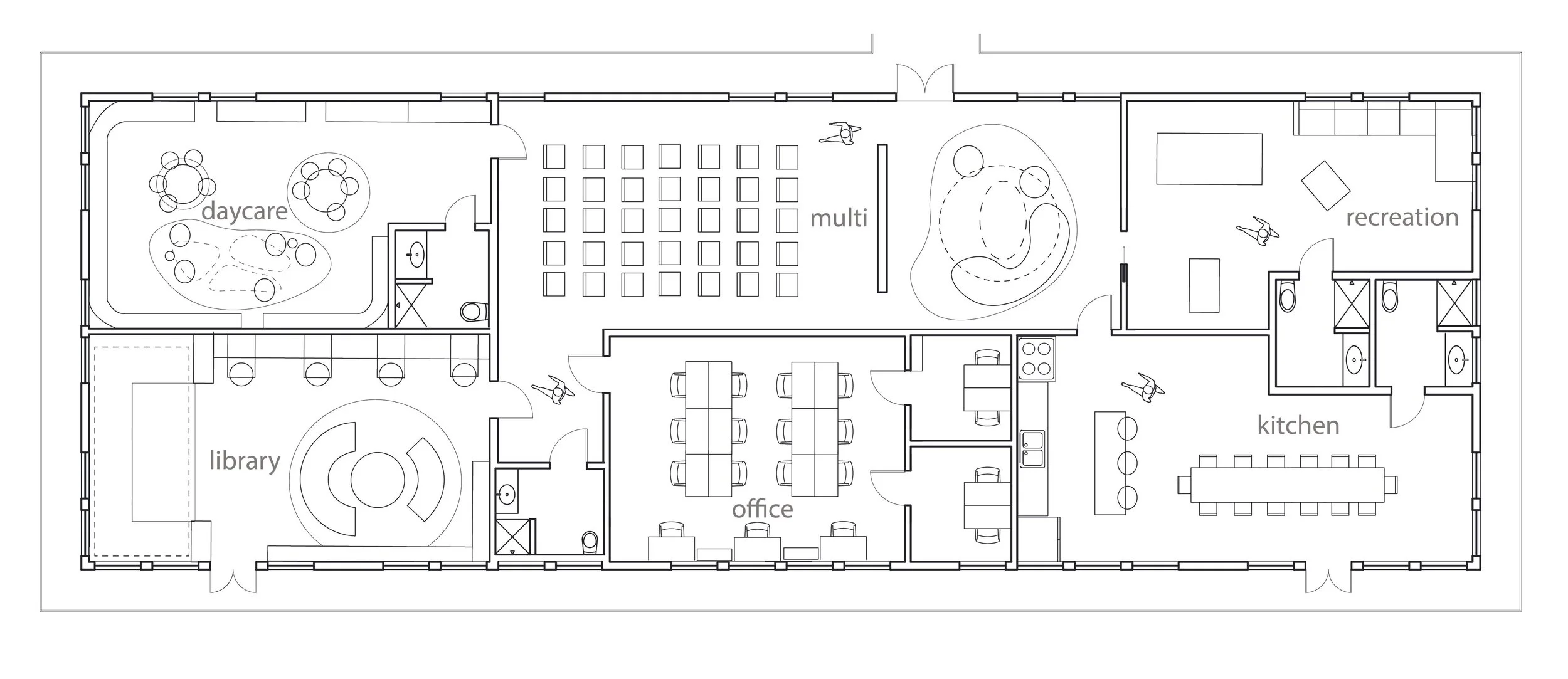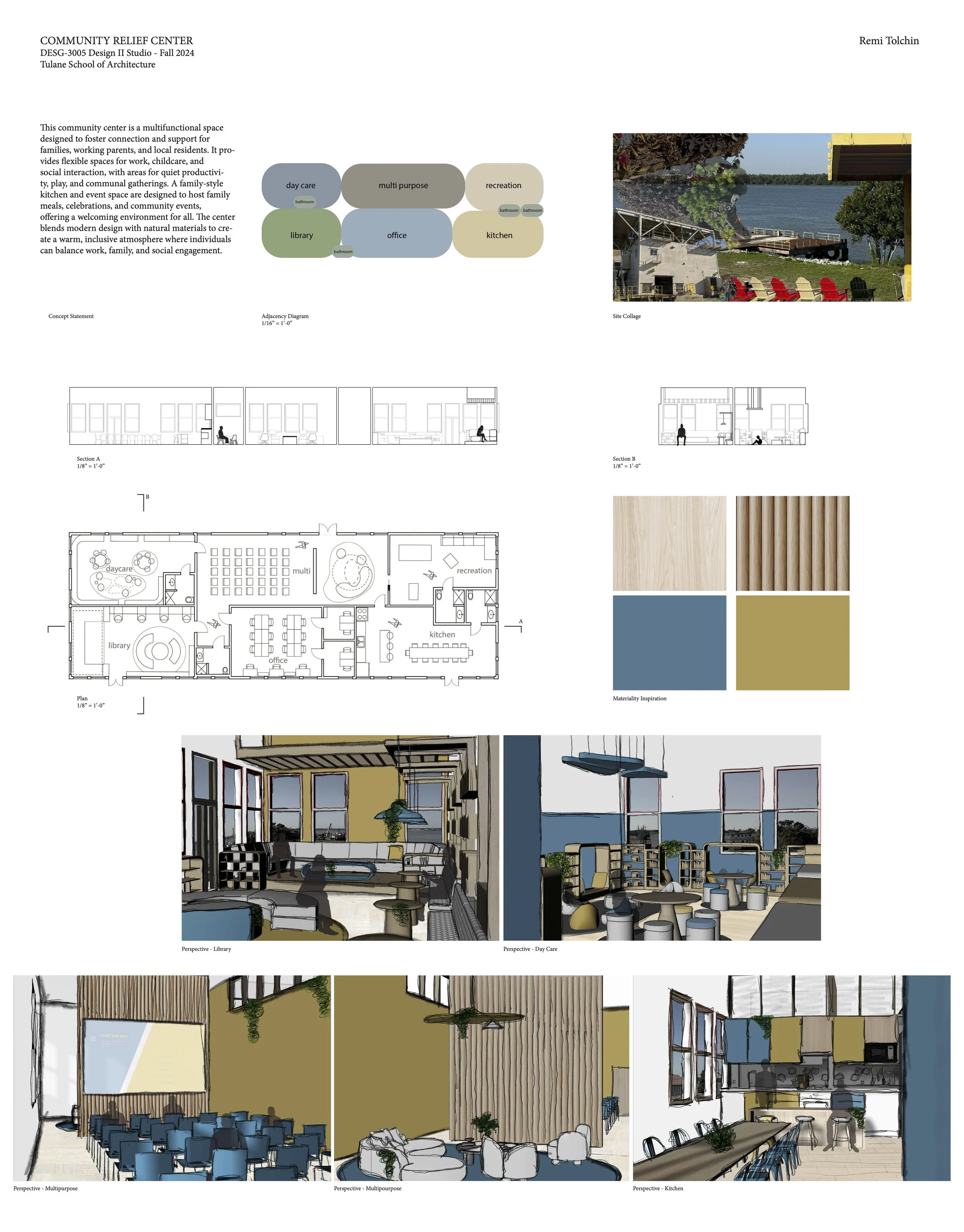 This multifunctional community center was designed to foster connection and support among families, working parents, and local residents along the Rigs at the Batture in New Orleans. The space prioritizes flexibility—featuring designated areas for quiet productivity, active play, and social interaction. A family-style kitchen and adaptable event space serve as the heart of the building, providing a warm, welcoming setting for shared meals, celebrations, and neighborhood events.